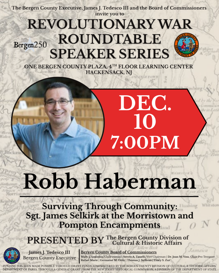 The Bergen250 initiative, through the Bergen County Division of Cultural & Historic Affairs, continues its Fall Series of Revolutionary War Roundtable presentations with another compelling installment. On Wednesday, December 10th at 7:00 PM, historian Robb Haberman will deliver a lecture titled “Surviving Through Community: Sgt. James Selkirk at the Morristown and Pompton Encampments.”