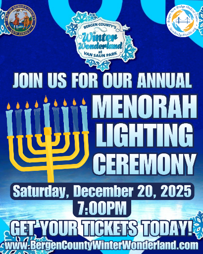 Bergen County Executive Jim Tedesco, the Bergen County Board of Commissioners, and the Bergen County Parks Department invite members of the media and the public to attend a Menorah Lighting Ceremony as part of Bergen County’s Winter Wonderland.
