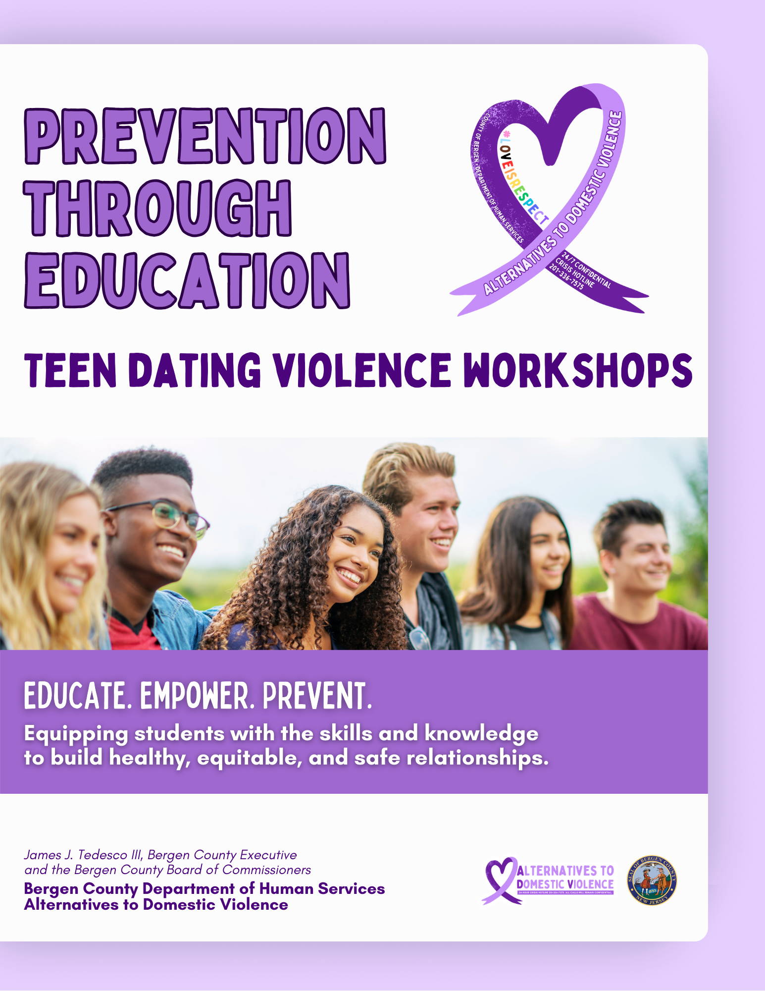 Our Prevention Through Education (PTE) services offer free educational programming to Bergen County residents about the prevalence and warning signs of domestic violence and dating abuse, how to detect signs of unhealthy relationships around us, and how to engage individuals and families in helpful resources safely. Our educational programming is available in interactive presentation, workshop, and roundtable event formats. All events can be customized by PTE educators for different audience groups and settings.