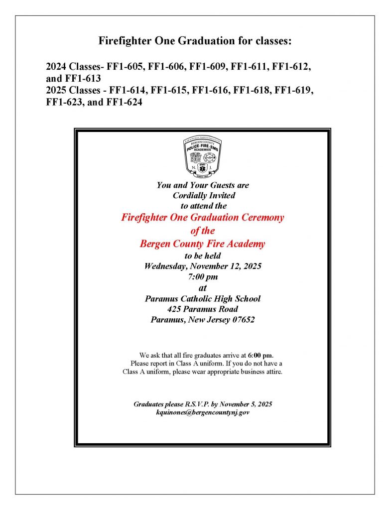 Wednesday, November 12, 2025 – Firefighter One Graduation for classes:2024 Classes- FF1-605, FF1-606, FF1-609, FF1-611, FF1-612,and FF1-6132025 Classes – FF1-614, FF1-615, FF1-616, FF1-618, FF1-619,FF1-623, and FF1-624