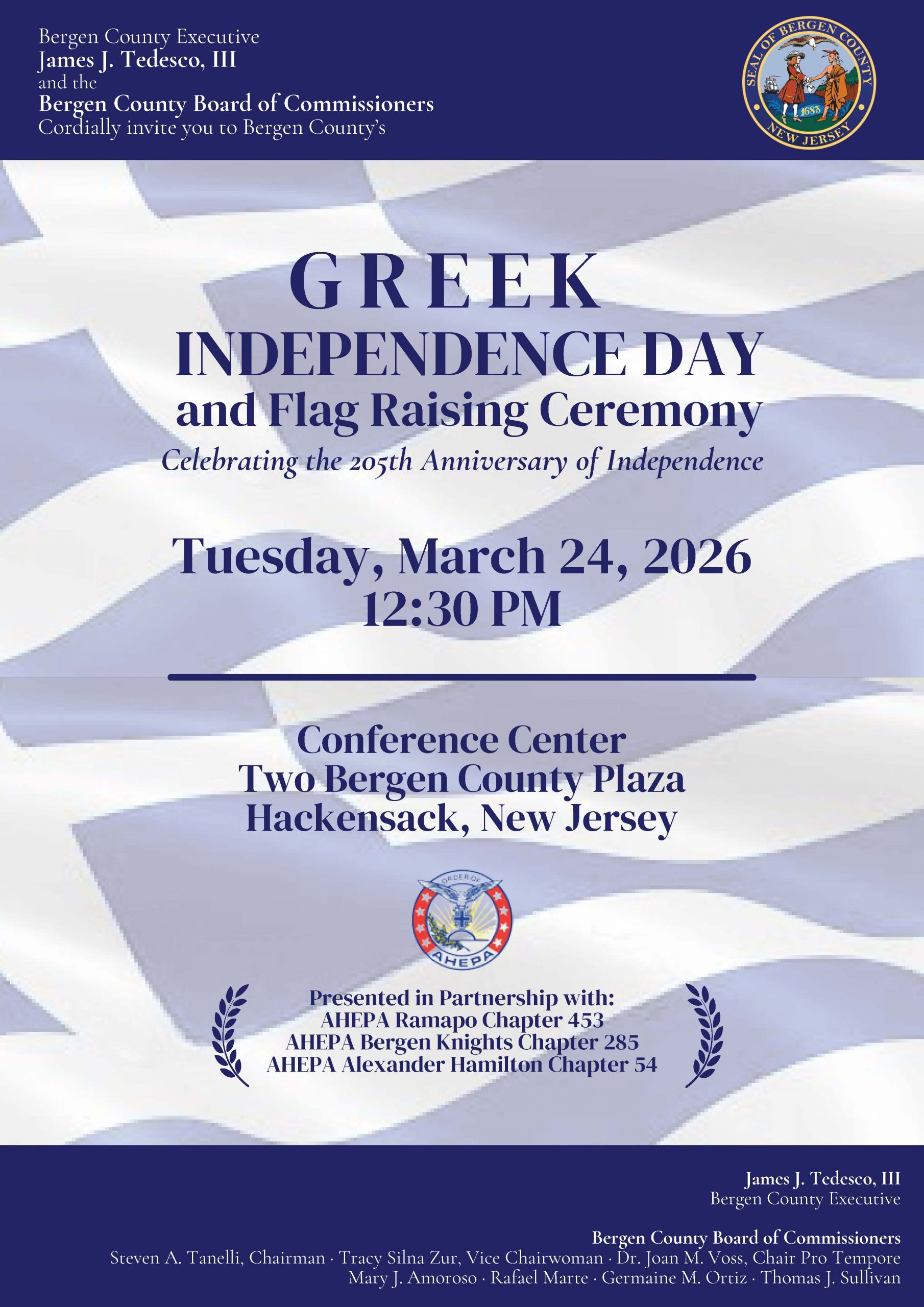 GREEK INDEPENDENCE DAY and Flag Raising Ceremony Date Mar 24 2026 Time 12:30 pm - 1:30 pm Location Two Bergen County Plaza 15 Court St, Hackensack, NJ 07601 Share this event